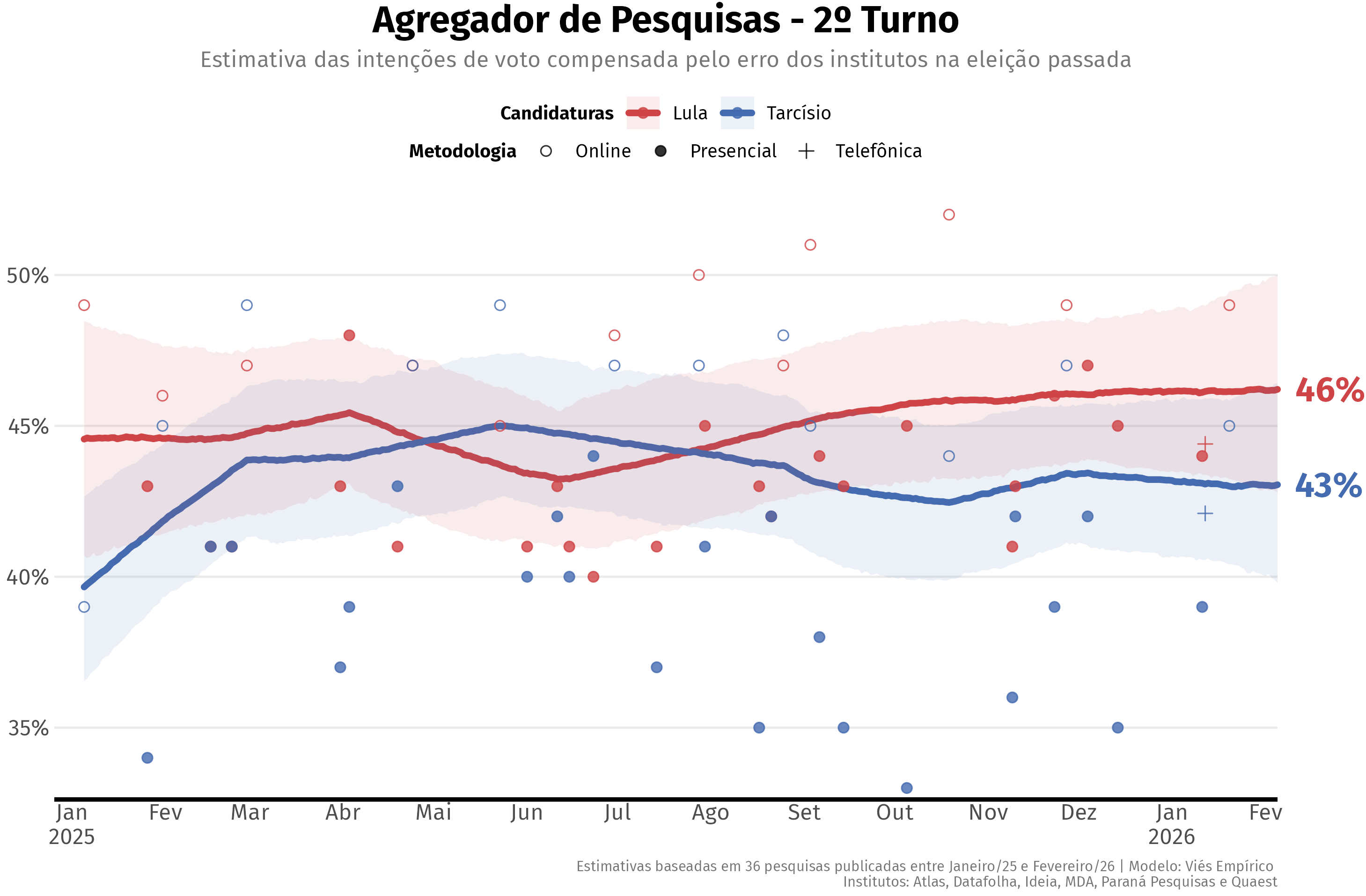 Historical data is sourced from Poder360’s polling database via Base dos Dados.