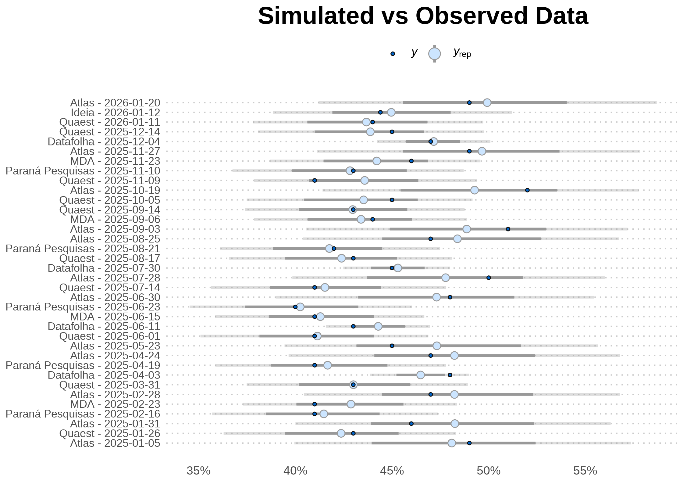 - Joint Parameter Updating: As new polls are published, it dynamically updates candidate support levels while simultaneously re-evaluating the reliability of each institute.